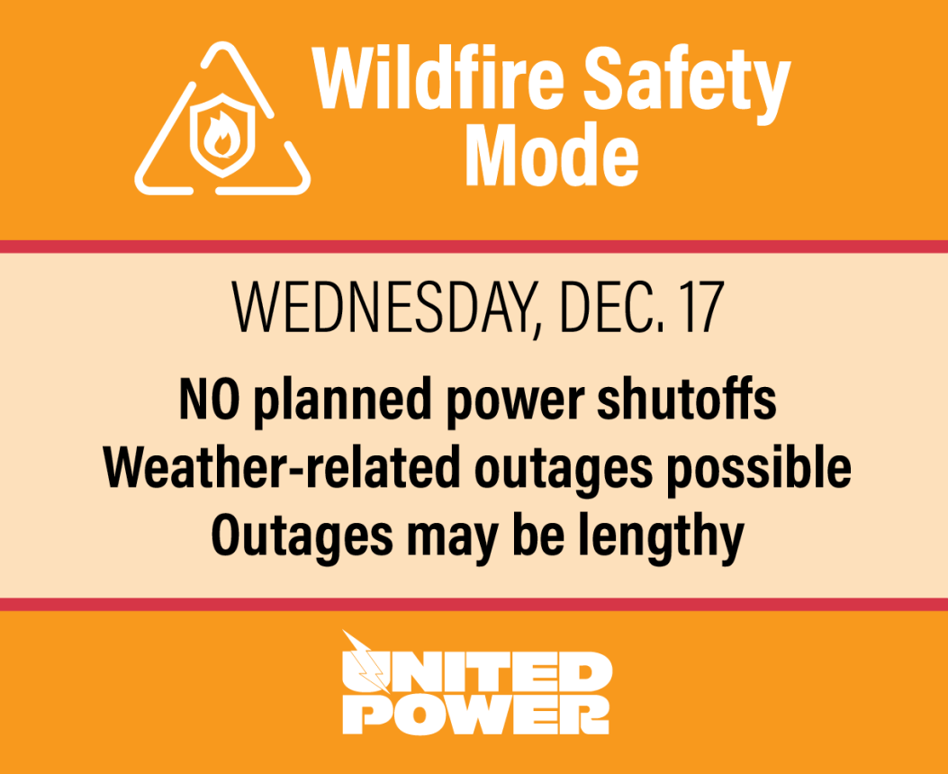 At this time, there are no United Power-planned public safety power shutoffs (PSPS). However, should power be lost to the Xcel Energy transmission line serving the United Power mountain area, restoration will be delayed until the wind event concludes.